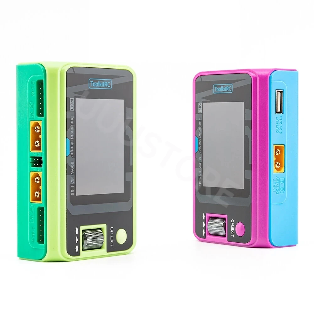 Input: 7-28V@MAX30A Battery Type: LiPo LiHV LiFe Lion@1-6S NiMh @1-16S Pb @1-10S Bal Cur. : 800mA @2-6S Accuracy: <0.005V Charging Power: 0.1-15A@250W *2(Asynchronous mode) 0.1-25A@500W(Synchronous mode) Discharging Power: 0.1-15A@250W*2 Recycle Mode 0.1-3A@12W*2 Normal Mode USB: 2.1A@5V upgrade@USB3.0 Battery Voltage: 1.0V-5.0V @1-6S Battery Internal Resistance: 1-100mR @1-6S Display: LCD IPS 2.4 inch 320*240 resolution Size: 98mm*68mm*35mm Weight: 220g Size: 108.5mm*80.5mm*46mm Weight: 300g Packaging included: 1X ToolkitRC M6D Charger